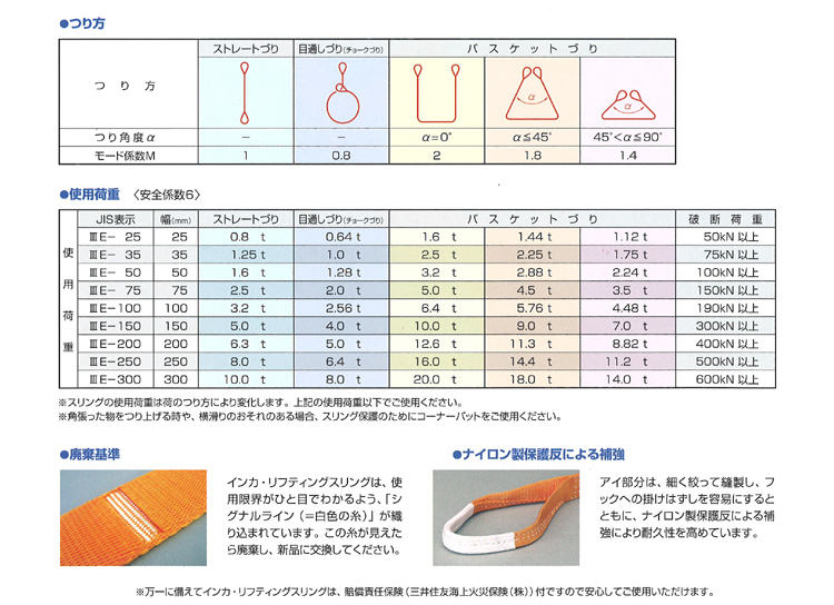 | インカ・リフティングスリングの原反は「3層構造」。この3層構造が強さと安全性を実現しています。さらに、インカ・リフティングス リングに使用している原糸は繊維性スリングに最も適した「超高強力ポリエステル」。インカ独自の縫製加工技術と相まって引張 強度、伸び、耐久性、耐候性、防腐性・・・あらゆる面でパワーアップ。まさにパワフルなスリングです。さらに、使用繊維に於いて はメーカーにて強度や伸びの試験を、完成品でも引張テストを徹底するなど、品質管理は万全の体制をとっています。インカ・リ フティングスリングは、キズを嫌うものの吊り上げ作業はもちろんの事、一般重量物の玉掛け作業や、荷の横引き作業など幅広 い作業現場で卓越した威力を発揮し、皆様のお役に立ちます。 |